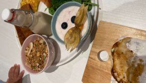 息子の手がすでに伸びていますが笑、オムレツに出来立ての厚みのある食パンと、チョコレートの入ったボリュームたっぷりのグラノーラに、ブルーベリー入りのヨーグルト。大きさに圧倒されます。