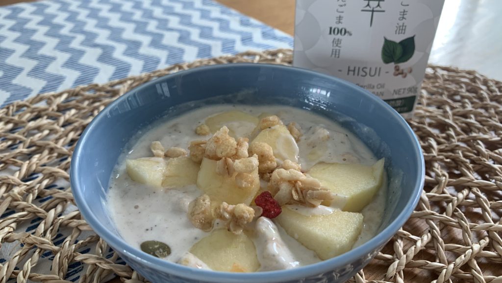 私は毎朝忘れないように、普段食べているヨーグルトにかけてみました。年々、朝ごはんが食べられなくなっている私。せめてもと、プロテインを溶かした自家製ヨーグルトにグラノーラとフルーツを乗せて毎日食べています。そこにえごま油を垂らしたら!なんということでしょう。一杯で最強朝ごはんの出来上がりです。
