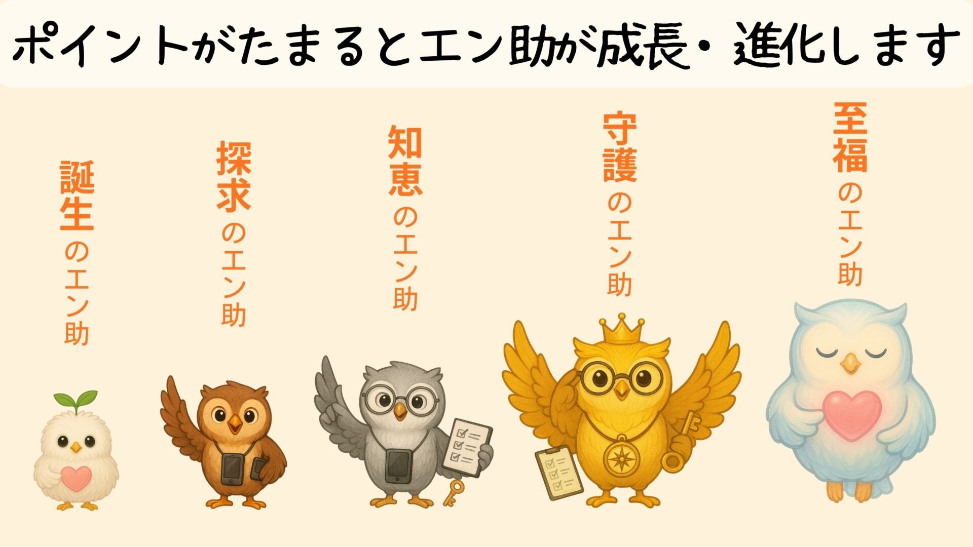 新しいアプリにはかわいいフクロウの公式キャラクター「エン助」が登場し、終活ワークを進めていくとポイントがもらえ、ポイントがたまるとエン助が成長・進化していくので、楽しく取り組むことができるようになります。