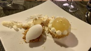 お気づきかと思いますが…ここまででもかなり食べています。が、やっぱりお楽しみのデザートは別腹!レモンとナシのパルフェは白ワインシャーベットとともに。ゼリー状のレモンとナシのボールにスプーンを入れ、周りのホワイトチョコレートなどと味わう、至福の時間。これにはG.D Vajraのピエモンテの甘いワイン。おお、完璧すぎる組み合わせ!改めてワインの種類の多さと可能性にびっくり。