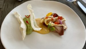 香ばしくいくらでも食べられるパン、スパイシーな前菜の後、まず魚料理からスタート。プリプリのハマチはゆずドレッシングと相性抜群で、アボカドのクリームもあっさり、さわやかなSanta Margheritaのピノグリージョのイタリアワインを。美味しくてあっというまに完食。食事とお酒の組み合わせって大事ですね!