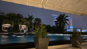 マンダリン オリエンタル シンガポールは、マリーナスクエアにあり、ホテル内にはおしゃれなレストランやバー、贅沢なスパも入っています。今回初めて足を踏み入れました! 5階のレストランフロアに到着し、テラスの方に向かうとそこに大きなロゴが。フレンドリーな店員さんの案内で外の席へ。目前に開放的なプールやベイエリアが広がりました。あいにくの雨にも関わらず、食事の楽しみな気持ちもあいまって、すがすがしい気持ちに!この、コース料理を待つ時間って楽しいですよね。