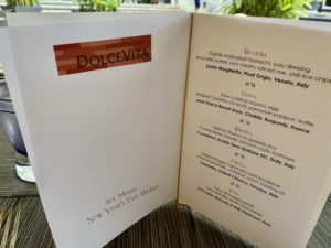 今回は大晦日のスペシャルメニューに、このお店のオシでもあるワインとのペアリングをセットに。お食事ごとにそのお料理にあったワインを出してくれるコースです。メニューを見ただけでも、ハマチ、トリュフ、ロブスター、Wagyu、パルフェ…と、スペシャルメニューにふさわしい豪華な食材がずらり…!見るだけでお腹が空いてきます(この記事を書いている今もお腹が鳴ります)。