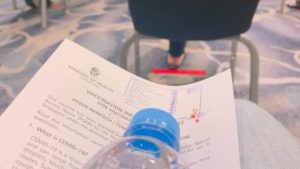 予防接種が終わると、私が行った会場では係員から一人一人にペットボトルに入った水無料で配られていました。水分を取りながら30分間ほど待機室で座って異変が起きないかチェックする時間があります。