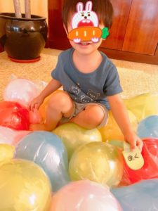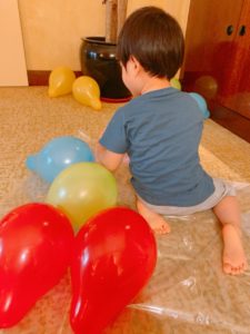 隔離中最も2歳児が喜んだ遊びは風船と圧縮袋で作った「バルーンマット」です。風船を圧縮袋に入れてホテルの掃除機で吸引して作りました。風船はただ膨らませたり萎ませたりするだけでも楽しいですし、お風呂に浮かべて遊ぶのも楽しいですし、色んな遊びに使えて良かったです。
