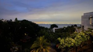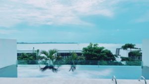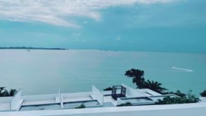 海の向こうのシンガポールを眺めながら。(写真には写りませんが、肉眼だとマリーナベイサンズが見えます。)