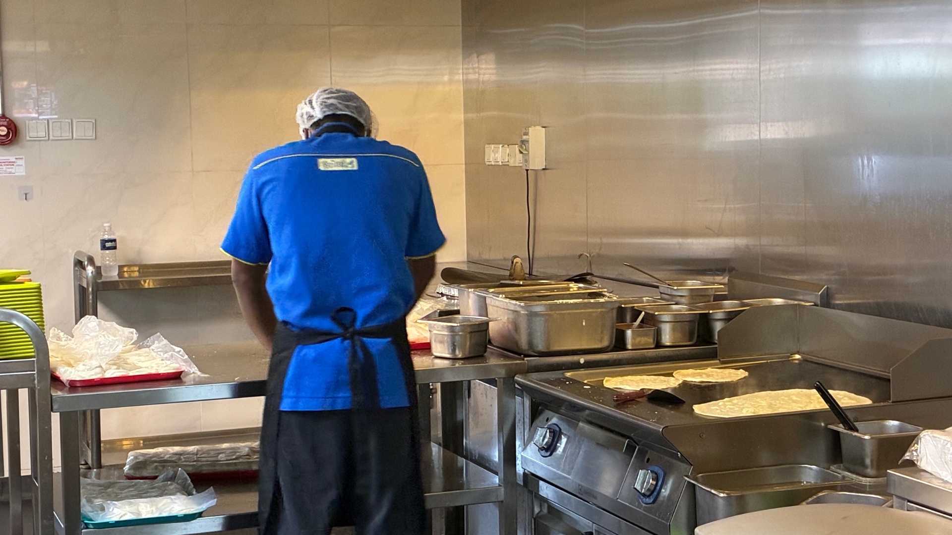 ロティやパラータは中央の鉄板で焼かれ、熱々のまま提供。ベジタリアンとノンベジタリアンのメニューがあり、クリア板越しに「これはベジ?」と生徒とスタッフが自然にやり取りする様子も見られます。