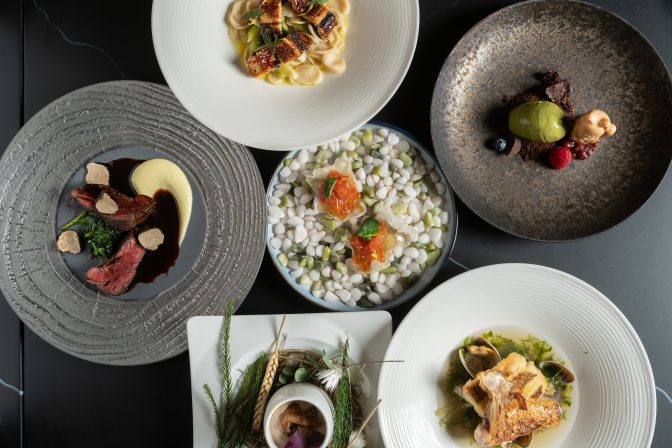 サーモンタピオカクラッカー、鰻とディル、自家製オレキエッテ(レモン 風味のガーリックとあさりのストックで)、牛ヒレ肉のステーキと黒トリュフ、さつまいもの最中と泡チョコレート 抹茶のジェラート