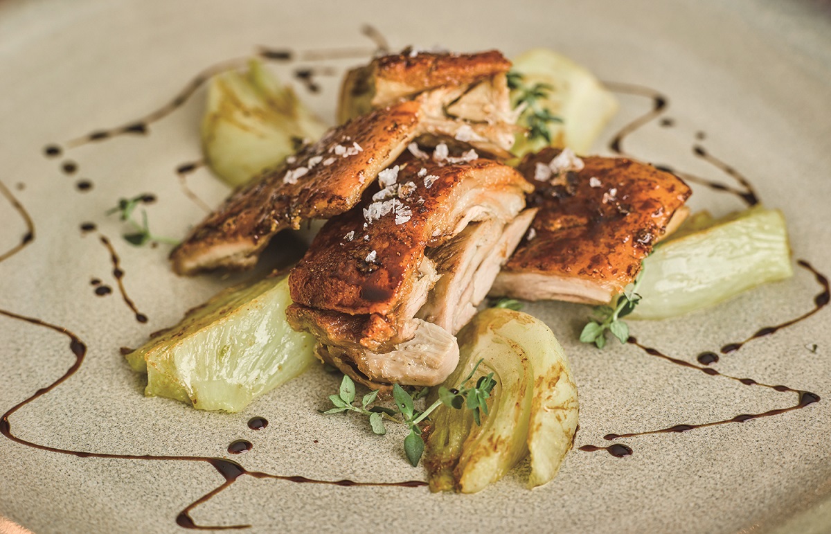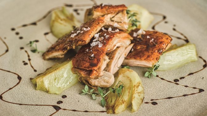 アカシアの蜂蜜とバルサミコ酢でカリッと焼き上げたポークは、グリルした甘いオニオンとともに