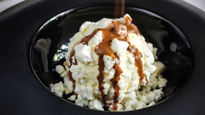 大人のためのデザートでディナーの締めくくりを彩る「ピスタチオ入りアイスメレンゲケーキのホットチョコレートシロップがけ ($16)」