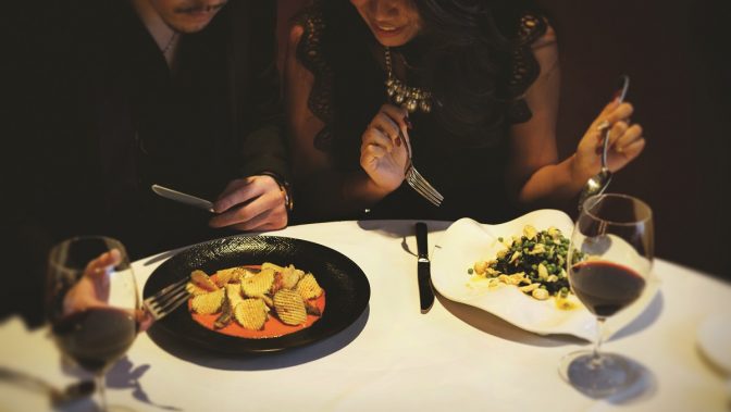 ふたりがこの日選んだのは、イカ墨パスタと鯛のトマトクリームフォンデュ。ワインと料理のペアリングで 食事の時間をエレガントに演出すれば、自然と気持ちも高まる!