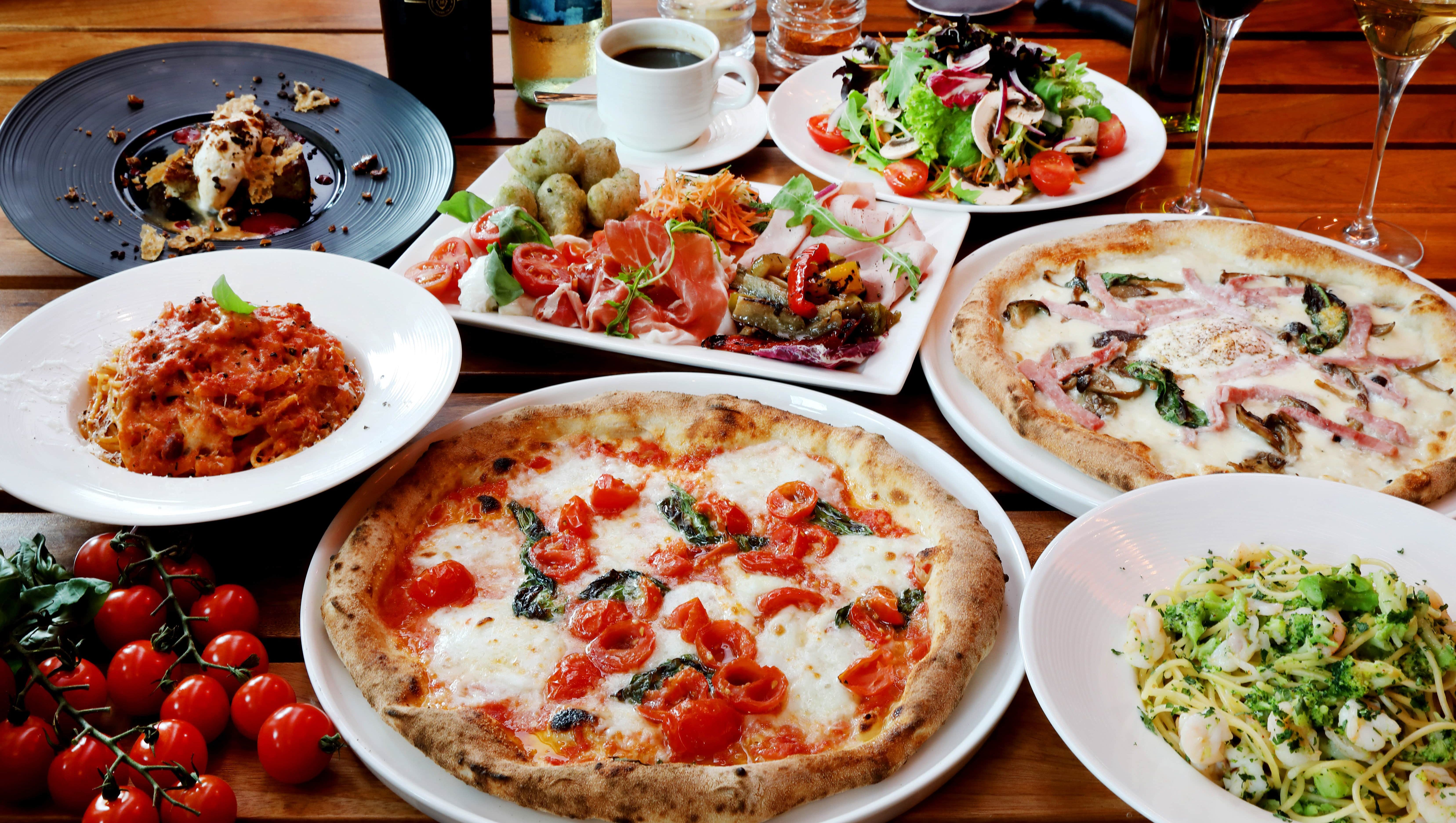 ピザ2 種、パスタ2 種、前菜盛り合わせ、サラダ、デザート
