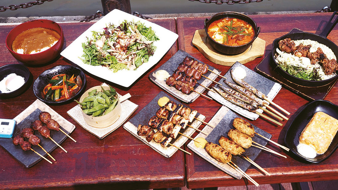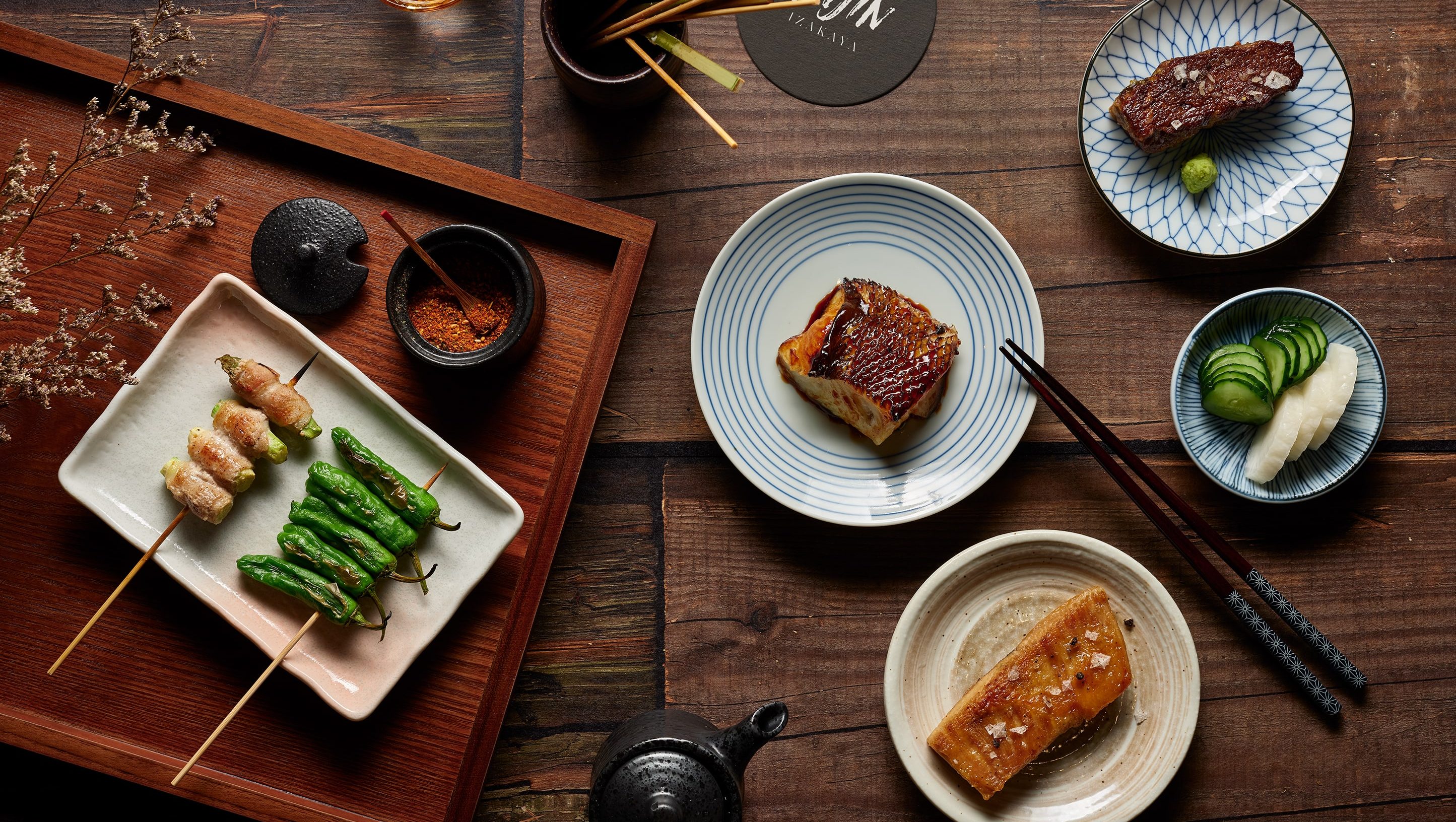 ザイオンロード沿いにある店ののれんをくぐり、回廊を進むと黒を基調としたモダンな空間が広がる。オーナーシェフのフレディリーによる創作料理は、串焼きやカツサンド、そうめんなど日本人好みのメニューがいろいろ。小皿に盛るスタイルは日本の居酒屋がヒントになったとか。珍しい日本酒や人気の焼酎も揃う同店で、気のおけない友達と一献傾けて。