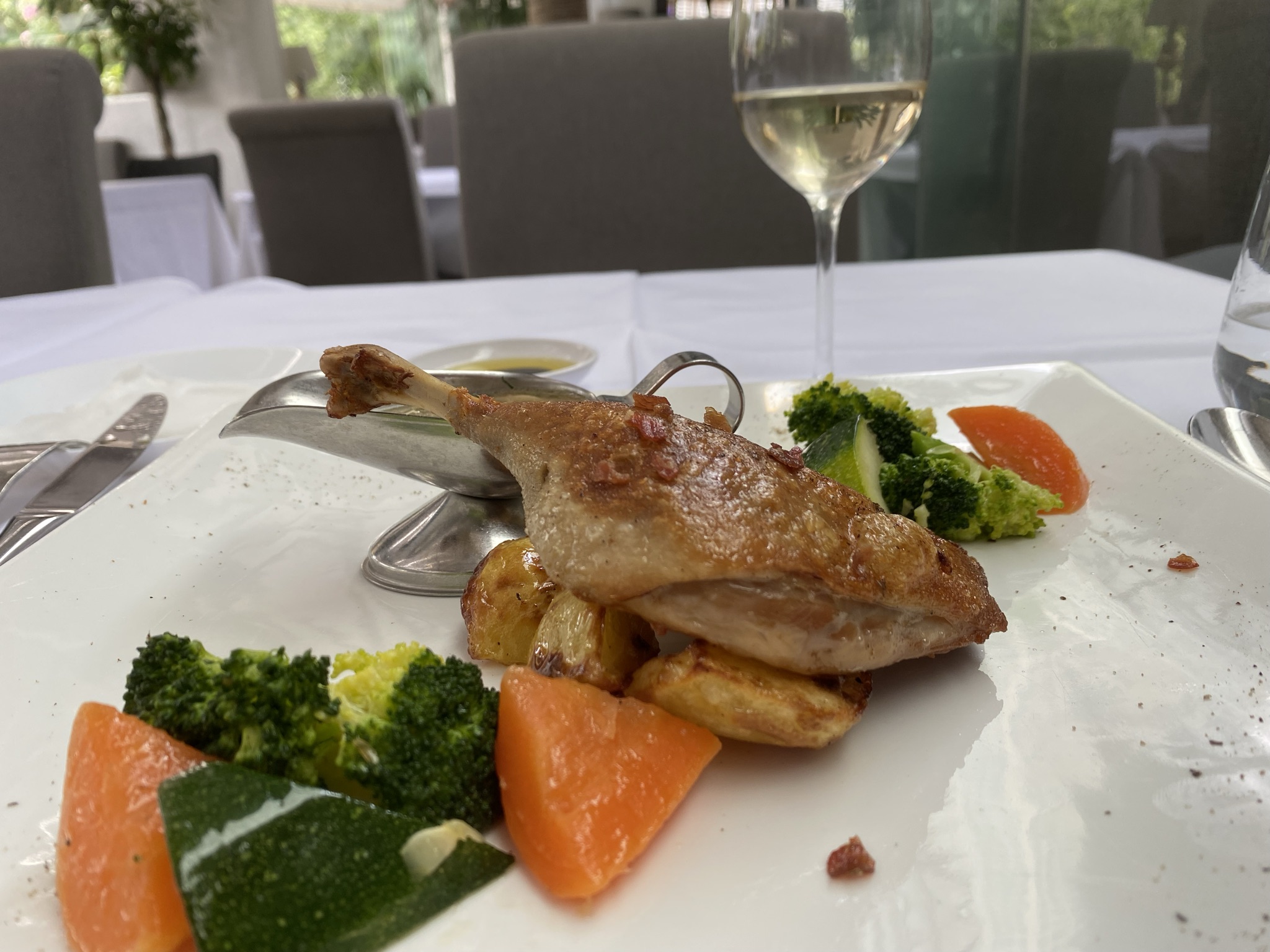 しっかりとマリネした鴨をカリっと焼き上げ、絶妙な温度で火入れした鴨のコンフィ。温野菜と、黄金色のジャガイモが添えられてサーブされます。