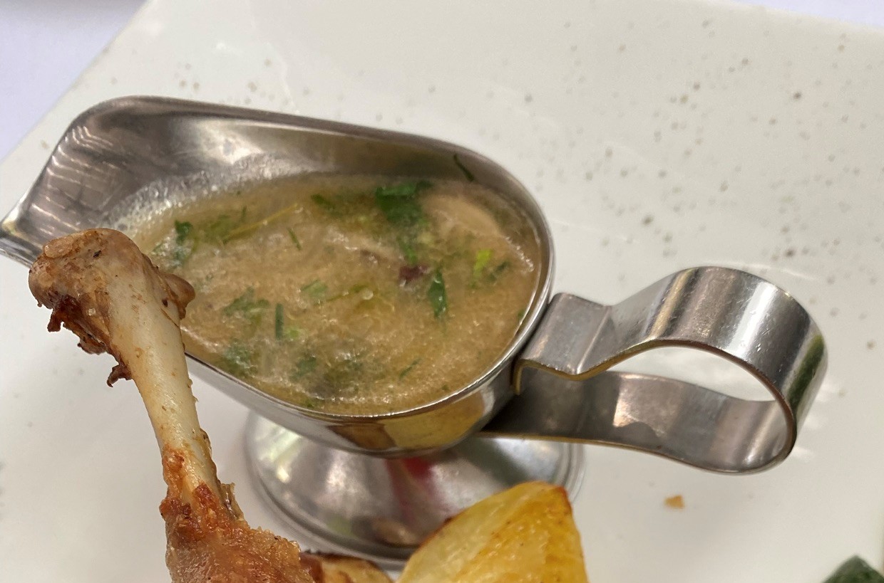 次にソースをつけて食べてみます。ソースは鴨を焼いた後に残ったグレイビーと、マッシュルームを合わせたソースです。さっぱりとしたお味です。