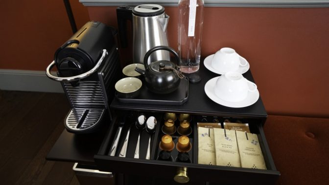 各客室のミニバーを開くと、ガラスのウォーターボトル、クリスタルのオリジナルグラスなどが美しい輝きを放ちます。客室内だけでなくホテル全館でプラスチック類を一切排除しており、カプセルタイプのコーヒーのアルミケースも使用後には館内でリサイクルし、ドリップ後のコーヒーパウダーは植物堆肥として再利用しています。デザインの完成度だけでなく「シックスセンシズ」が掲げるフィロソフィを肌で感じ、サスティナブルに貢献できるのも同ホテルにステイする醍醐味のひとつでしょう。